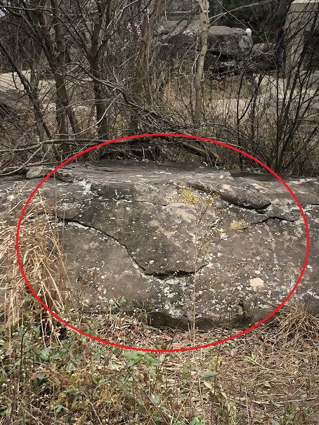 Blue arrow is crack in boulder that can be seen in the "Then" view.