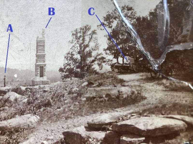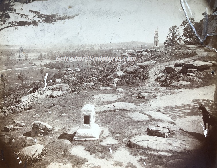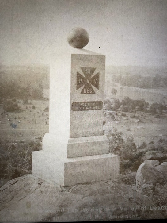 Early William Tipton photo of the first 91st Pennsylvania Infantry Monument located on Little Round Top. It was positioned where the current large 91st Pennsylvania Infantry monument stands today. View is looking west.