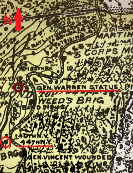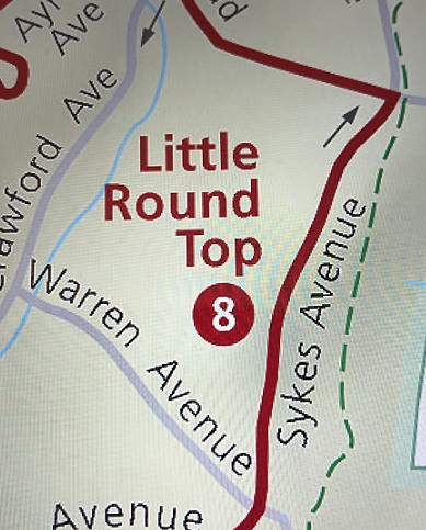 This photo is of the c1914 battlefield map showing the road to and from Little Round Top is much different than todays road. The road then weaved among the boulders and monuments. In some period photographs, horses and buggies can be seen near the various monuments.