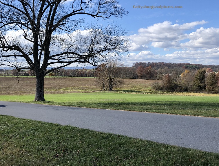 A view of the Barlow statue looking South. In the lower left corner is a yellow circle. This circle is marking the location of a water tower located on East Cemetery Hill. East Cemetery Hill will be the fall back position on the evening of July 1st of many of the 11th Corps troops fighting with Barlow's Division.