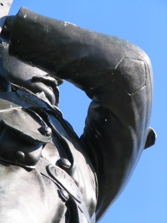 The sculptor has included the torn coat sleeve as if nipped by a passing bullet.