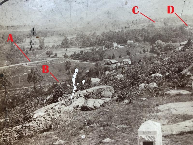 This photo is of the c1914 battlefield map showing the road to and from Little Round Top is much different than todays road. The road then weaved among the boulders and monuments. In some period photographs, horses and buggies can be seen near the various monuments.