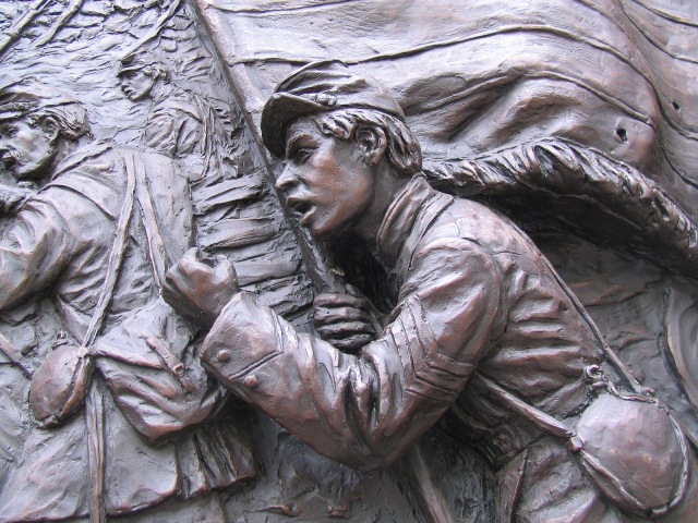 The bronze relief depicts Delaware soldiers along Cemetery Ridge who, having helped repulse Longstreet's Charge, hurl themselves forward in a countercharge.