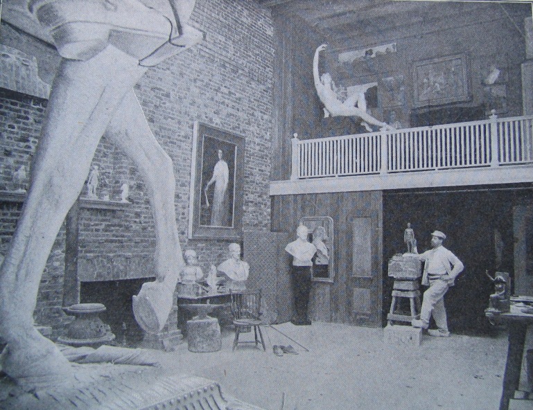 Above is a photo of Elwell in his Orange, New Jersey Studio. Note in the foreground the lifted hoof of the clay model of the Hancock Statue.